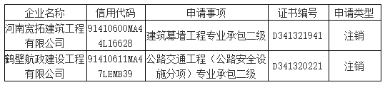 鹤壁市住房和城乡建设局关于河南宽拓建筑工程有限公司等2家建筑业企业申请资质注销事项的公示