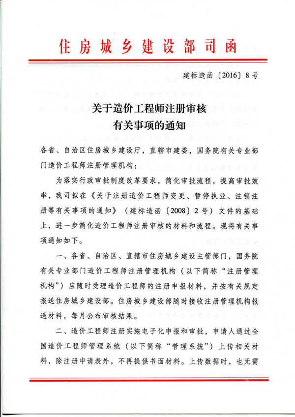 造价工程师注册审核有关事项的通知(建标造函[2016]8号)